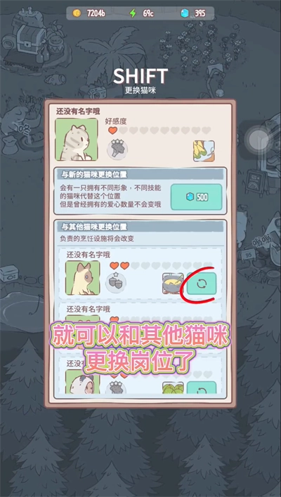 点击下图红框图标,就可以和其他猫咪更换岗位了