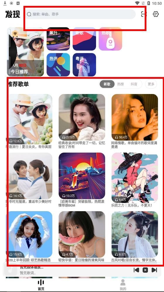 2. 打开云母音乐,在首页顶端的搜索框中,你既可以直接输入关键词来查找歌曲或歌手,也能够通过浏览推荐歌单,发现更多优质音乐。