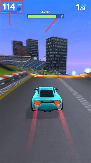 3、持续操控赛车超越剩下的对手,把排名提升到【1/8】,与此同时推动关卡进度条朝着终点前进。