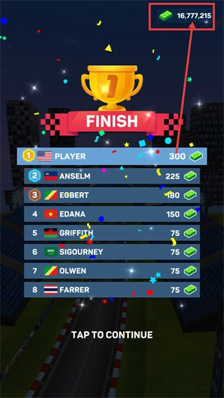 4、冲过终点后取得【第1名】的成绩,可领取【300金币】的奖励,目前总金币已累计到【16,777,215】,点击界面就能继续挑战后续关卡。