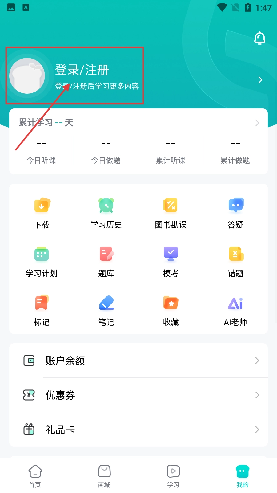 1、进入“我的”页面,找到并点击“登录/注册”按钮,完成登录操作后即可解锁更多学习内容。