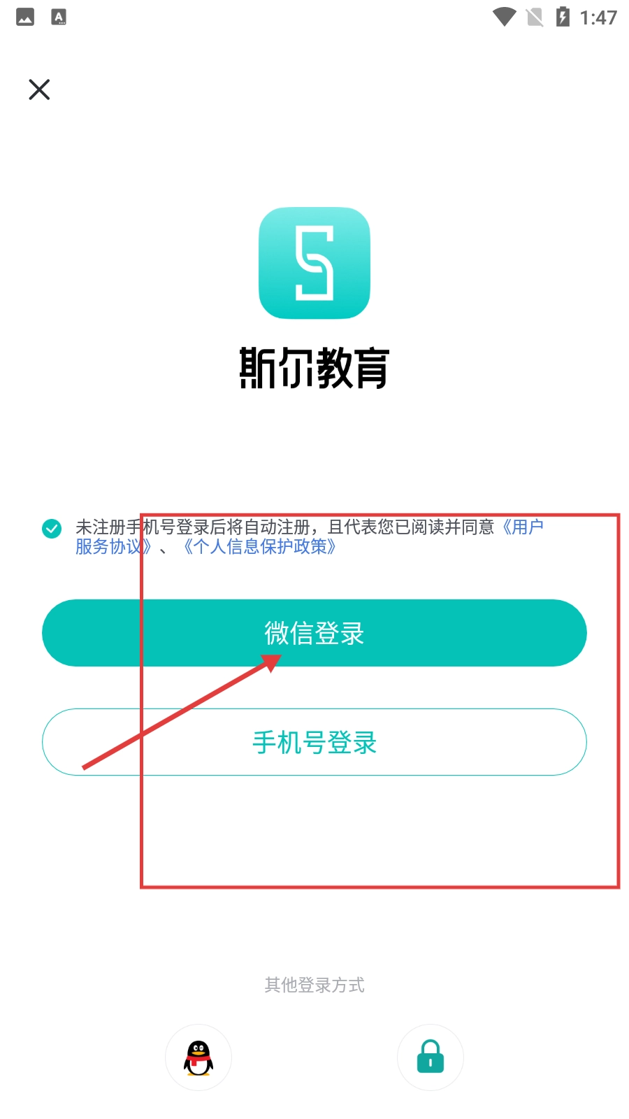登录界面设有微信登录与手机号登录两种选项,使用未注册的手机号登录系统会自动完成注册流程。
