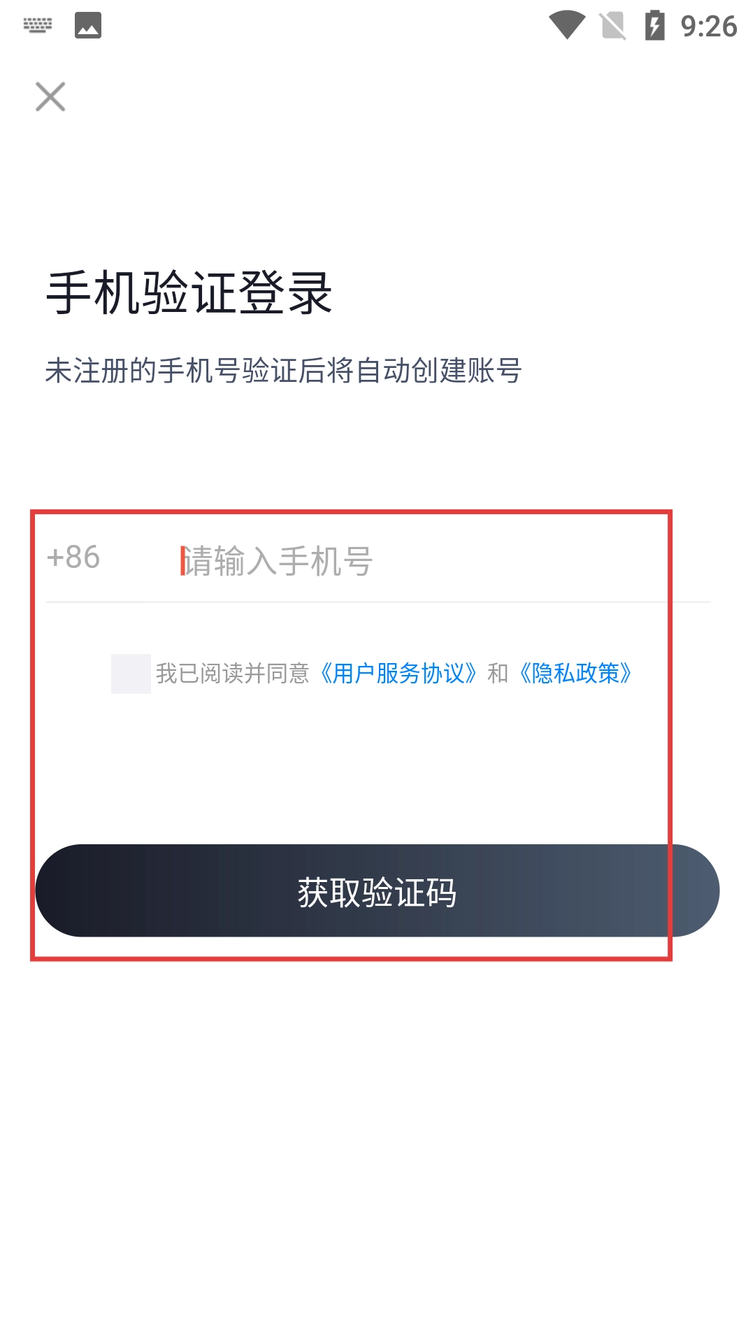 3、进入手机验证登录页面后,输入手机号,勾选同意协议,点击【获取验证码】按钮。