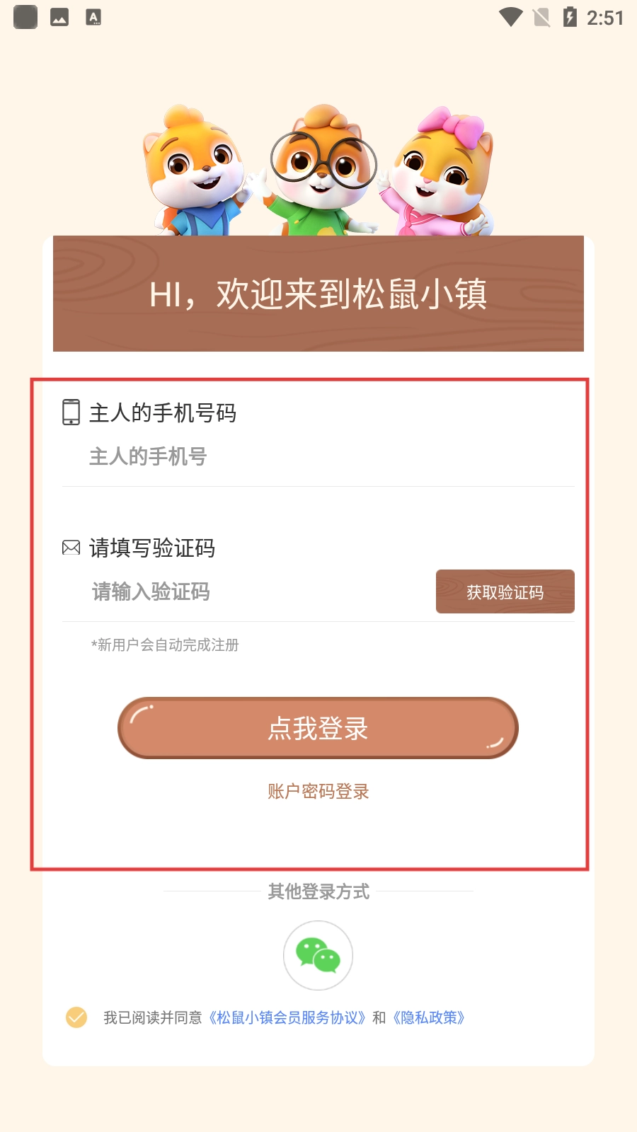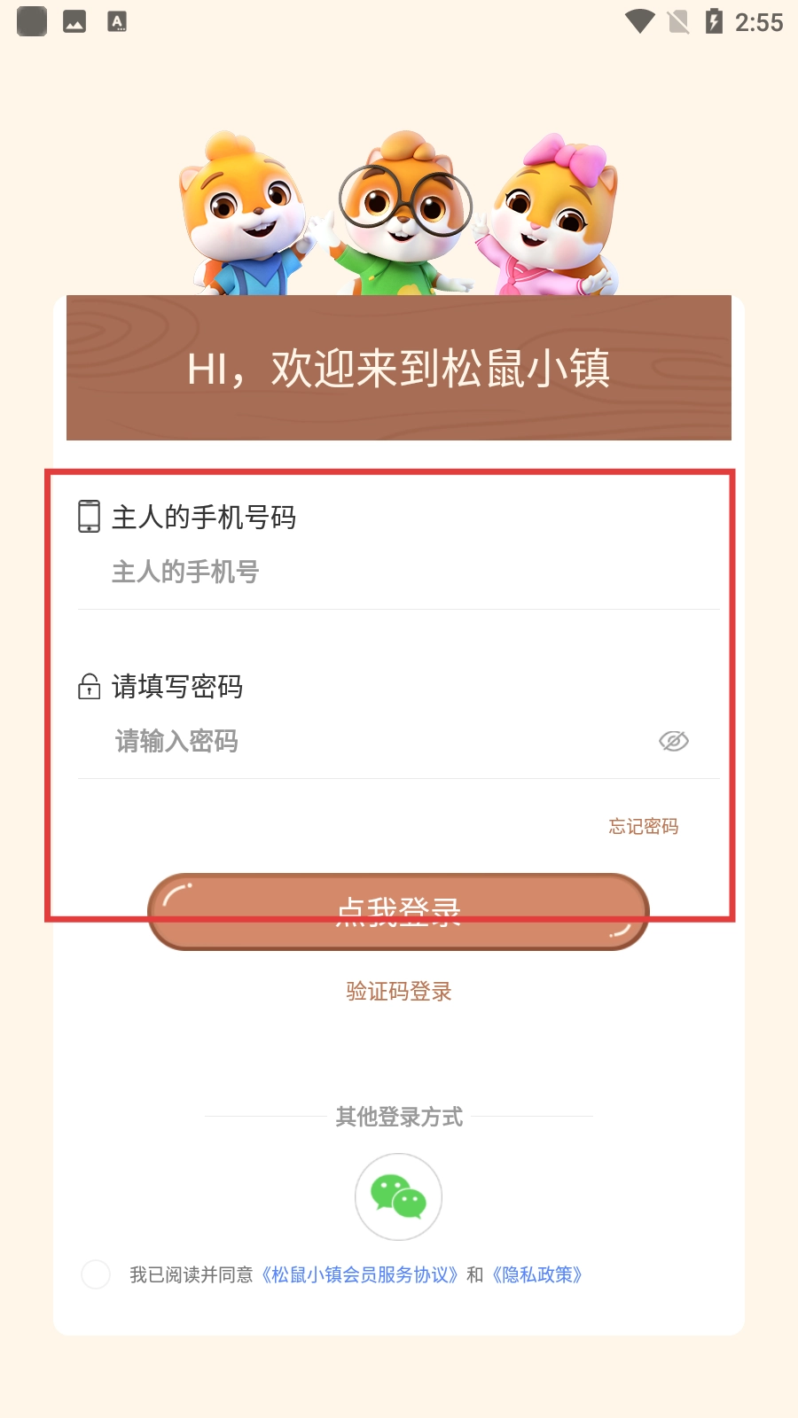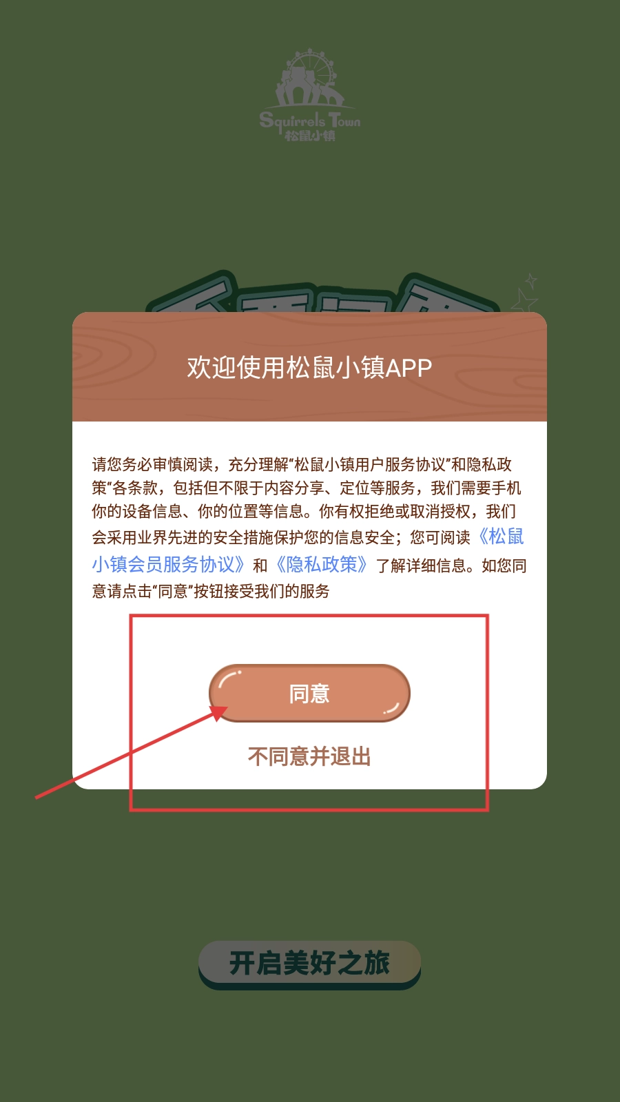 1、首次使用松鼠小镇时,点击“同意”按钮接受服务,也可选择“不同意并退出”。