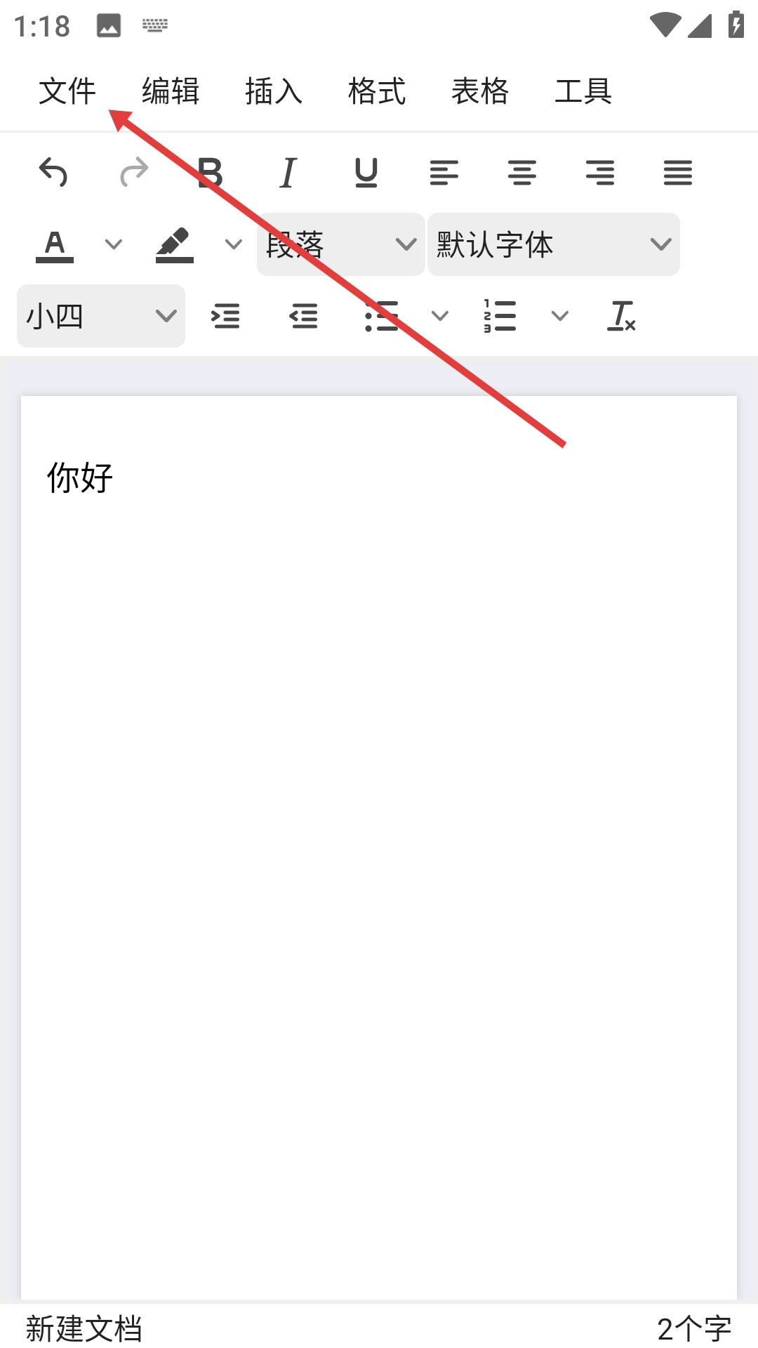 2、在文档编辑页面输入要编辑的内容,如【你好】。