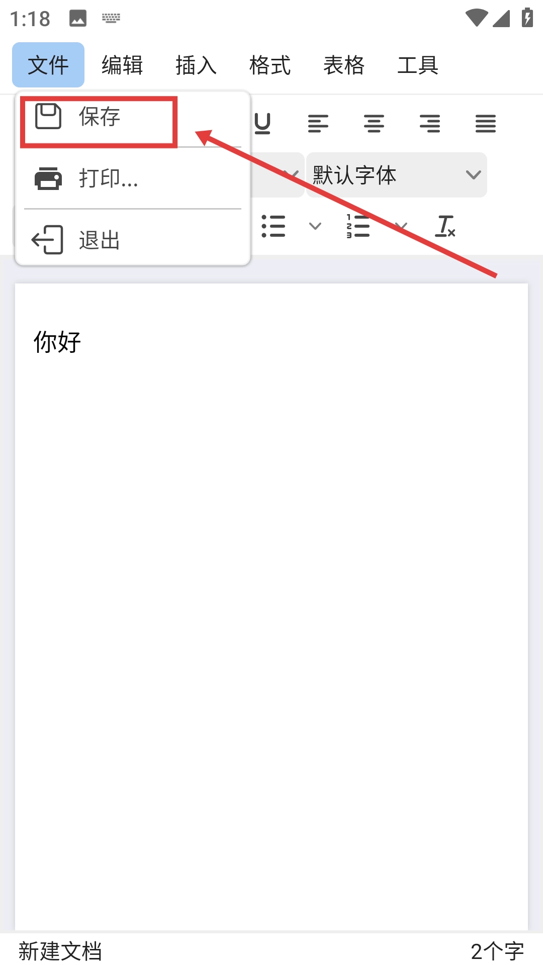 4、在文件操作菜单中点击【保存】选项,保存编辑的文档内容。