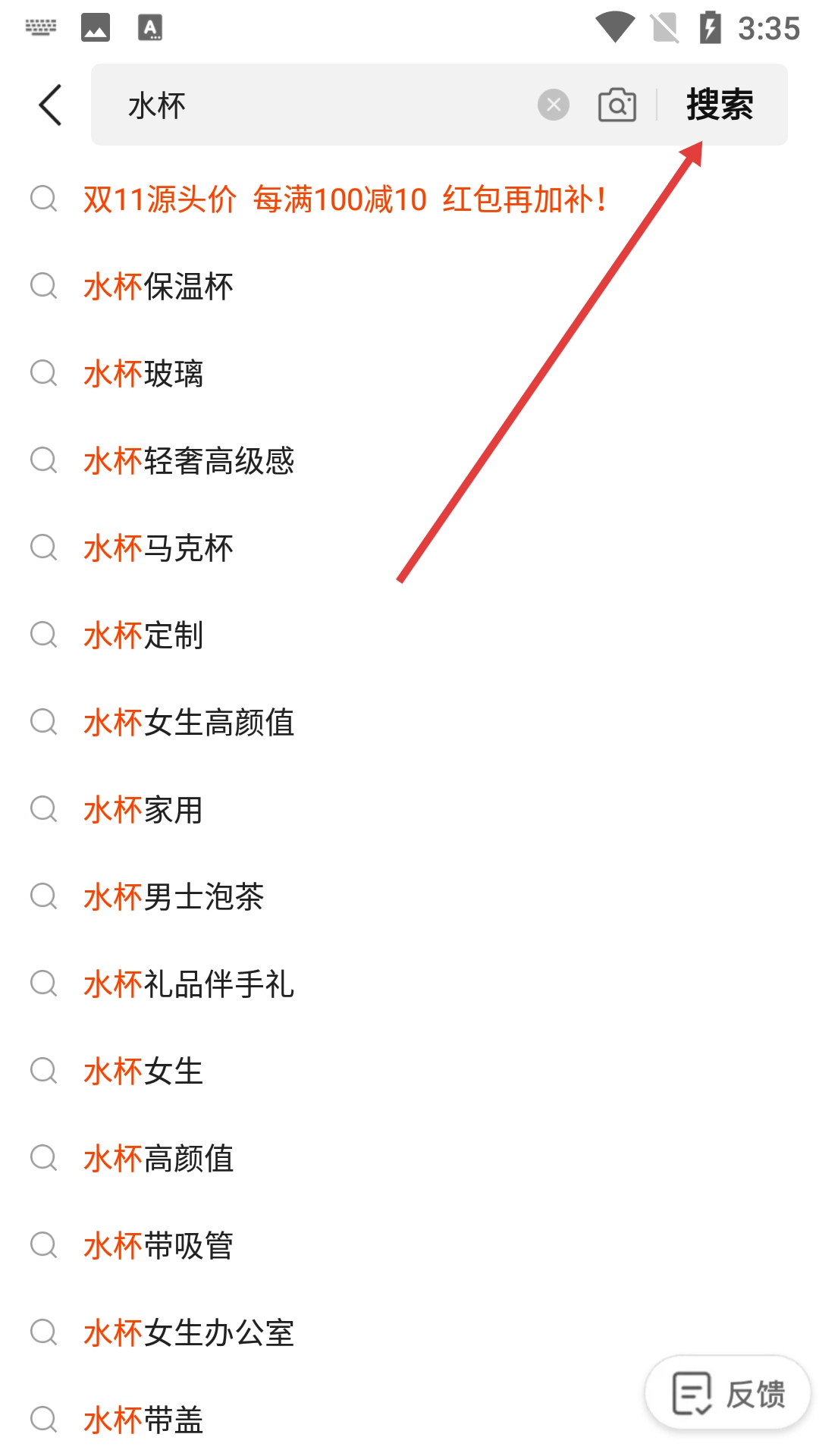 2、在搜索页面的搜索栏中输入要查找的商品名称,如【水杯】,点击【搜索】。
