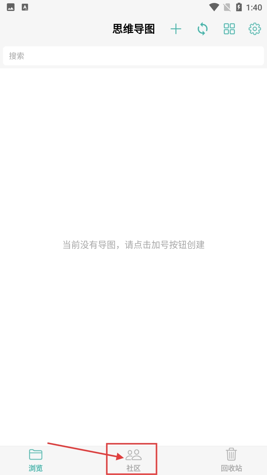 2、在思维导图主界面,若当前未显示任何导图,可点击加号按钮创建新的思维导图,此外界面还设有搜索、刷新等功能选项。