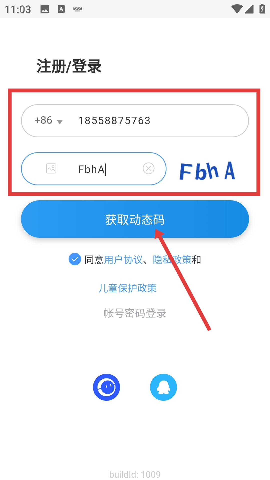 3、在注册或登录页面填写手机号与验证码,接着点击【获取动态码】按钮。