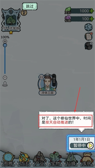 1、游戏内时间按天自动推进,可通过底部【图腾】【功法】等功能管理家族日常,提升初期实力积累资源。