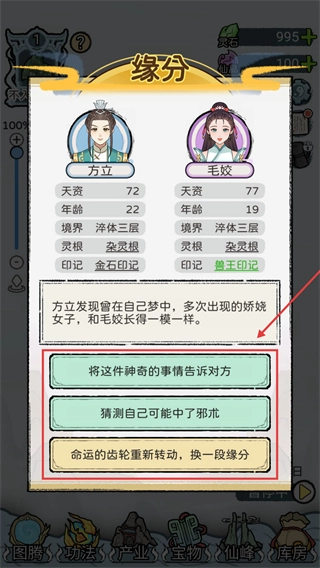 2、在缘分界面选择【将这件神奇的事情告诉对方】选项,提升与毛姣的亲密度,为后续联姻奠定基础。