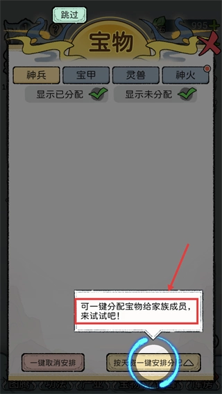 4、利用宝物界面的【按天资一键安排分配】功能,快速将宝物分配给家族成员,提升整体战斗力。