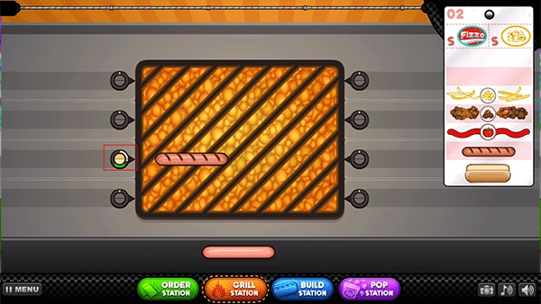先把热狗放在烤炉上,留意左边指针的颜色变化,等指针变成橙色时就再次点击热狗给它翻面。(记住别让热狗烤焦了哦)