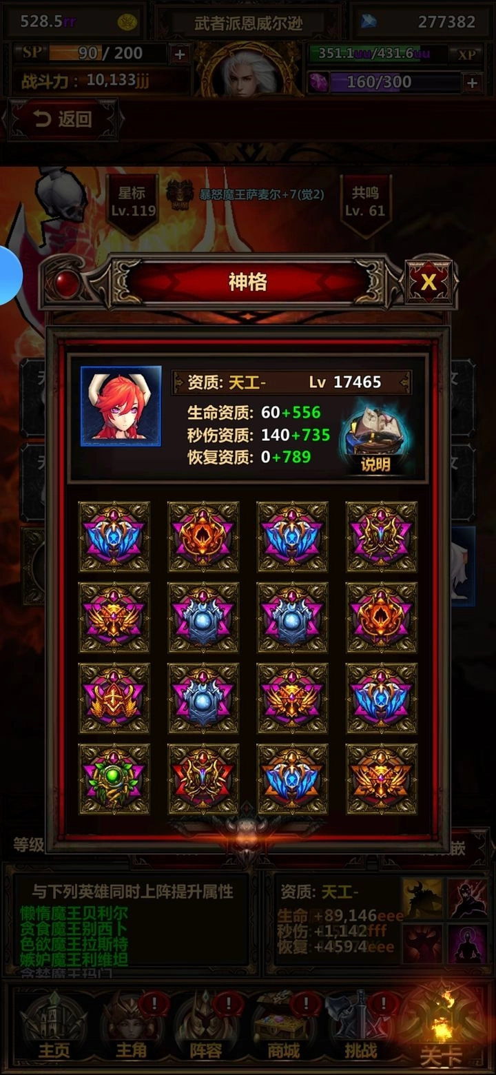 (1)通用装备(适配推图场景),选择穿戴高星级装备,对装备进行生命属性的附魔处理,并镶嵌能够增加生命值的秘石。