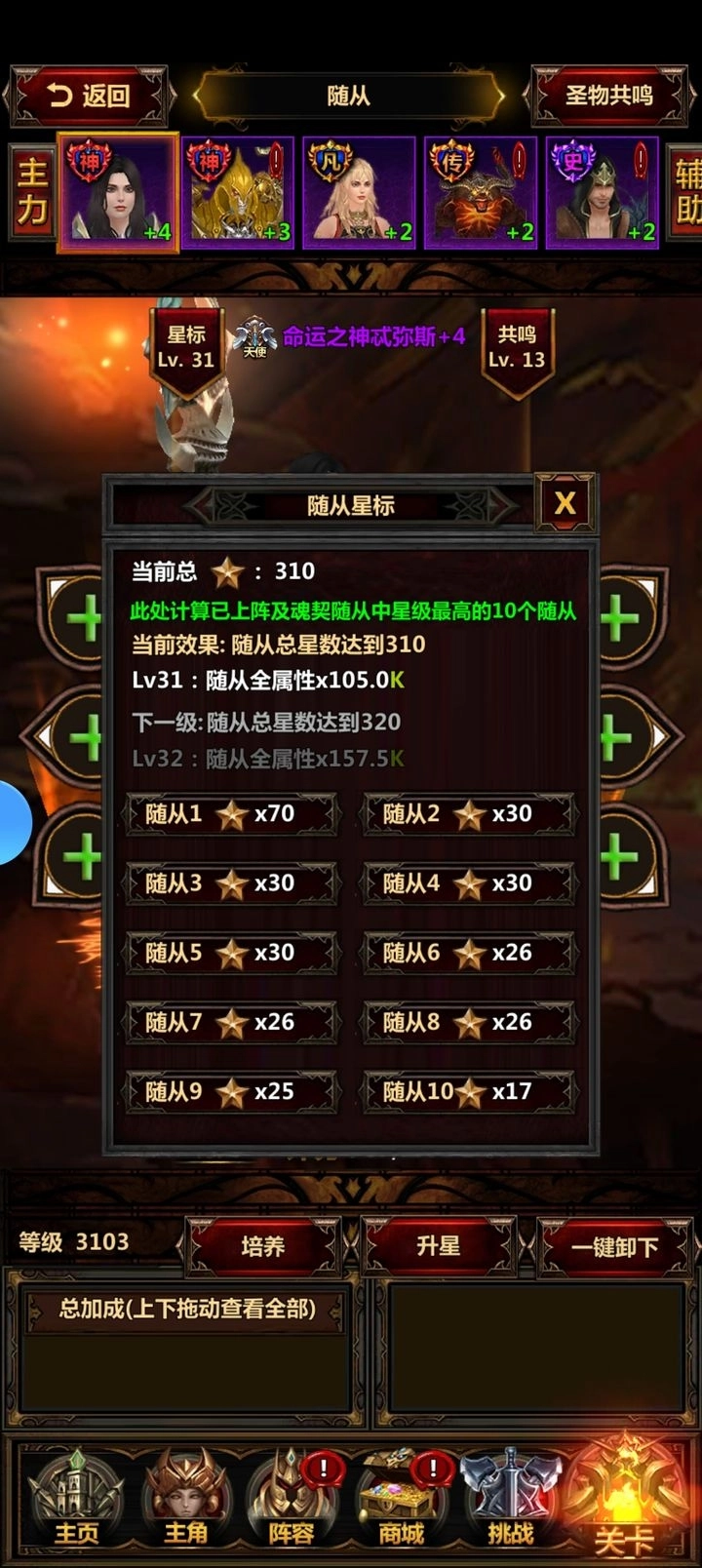 在前期推进关卡的阶段,要优先给一个主力随从提升星级;当这个主力随从升一级所需的资源,比给其他随从升5星的资源还多的时候,就优先把星标等级提高一级。