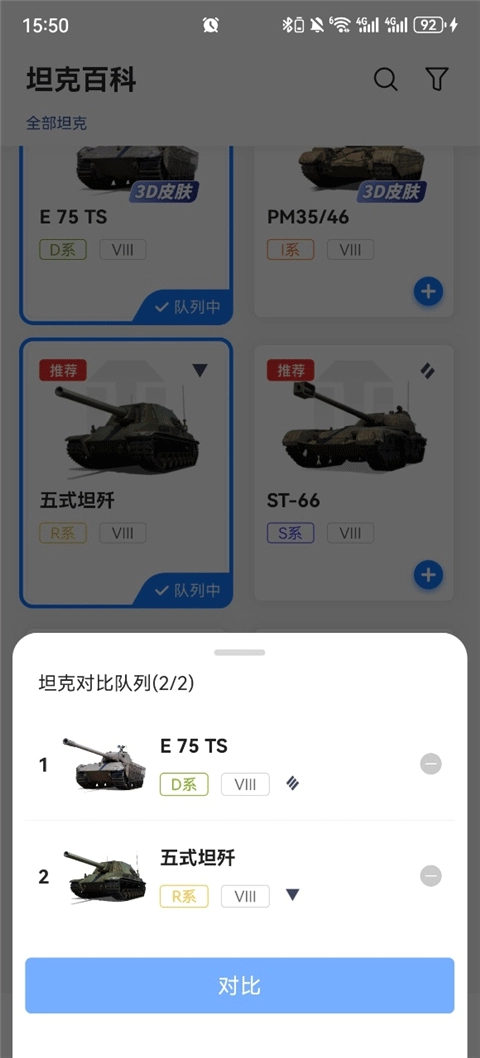 3、点击VS对比,即可查看你添加的坦克。
