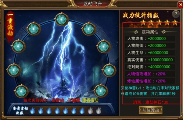 在游戏里,玩家能够借助渡劫飞升的方式增强角色属性。游戏总共设有十重渡劫关卡,每一重渡劫都得经受九道雷劫的考验。要是某次渡劫失败了,下一次渡劫时雷劫的数量就会减少一道。雷劫存在十种不同的类型,它们所造成的伤害程度也各不相同,并且玩家每次渡劫时遇到的雷劫类型都是随机分配的。