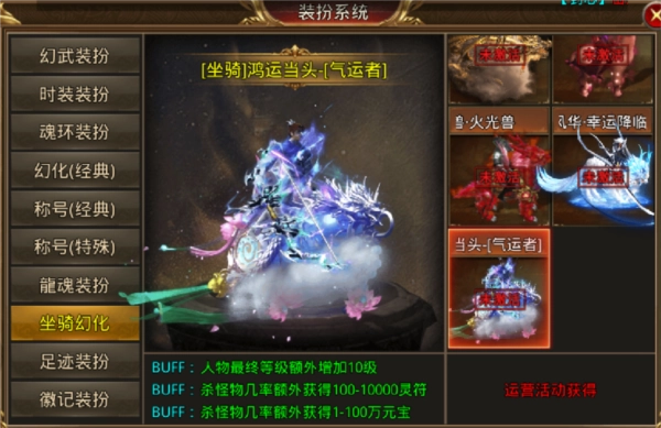 装扮系统涵盖的种类样式十分丰富,有幻武、时装、魂环、称号、坐骑、足迹等多个品类,每个品类都有着多元化的款式,相信总能找到一款合你心意的。