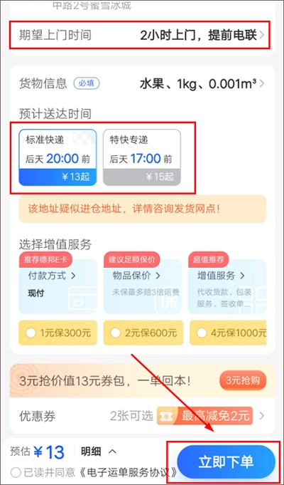 3、在【寄快递】页面,输入寄件地址与收件地址,及货物信息。输入完成后,选择寄件方式:标准快递、特快专递。然后再选择快递员上门时间,以上内容填写完成点击【立即下单】即可完成快递下单,之后耐心等待快递员联系你来取件即可。