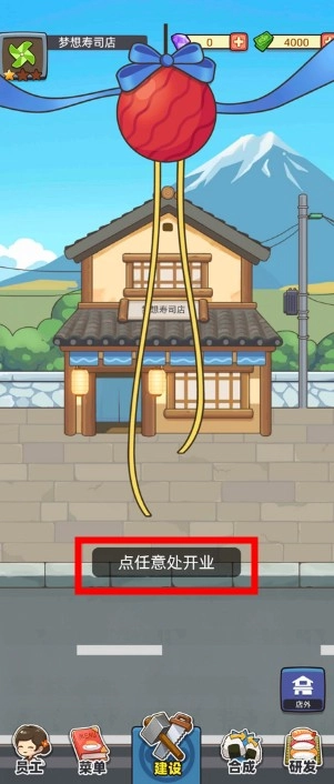 进入游戏后,和伙伴凉太一起打理寿司店。先把店铺卫生打扫干净,接着采购桌椅与厨房设备,最后点击【建设】按钮,就能完成初始设施的布置了。