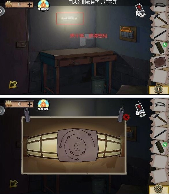 6、回到下水道区域,用钥匙开启图中对应的锁,取出木板;接着前往警卫室,用小刀划开垃圾桶,借助夹子夹取湿纸片,再将其放置在警卫室的灯上进行烘干,即可得到下水道密码箱的密码。
