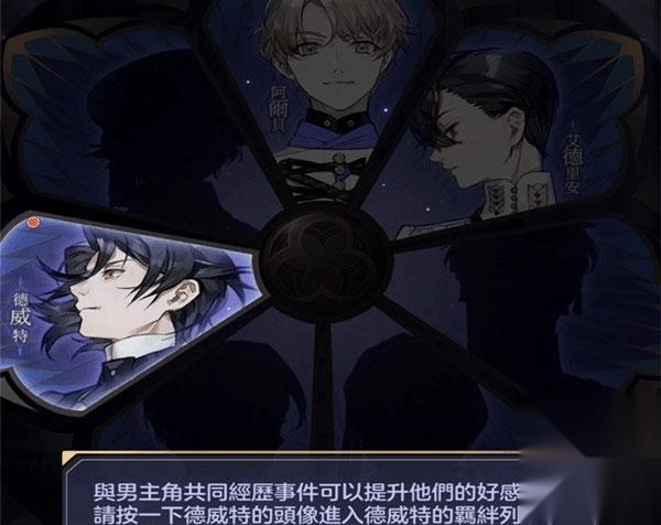 玩家选择其中一位男主角,即可开启专属的羁绊剧情,进入特定剧情分支。所有剧情均设定在特定场景中,玩家需跟随剧情推进依次进行对话,通过选择不同的对话选项提升男主角的好感度。部分对话选项需要满足特定条件才能解锁,例如好感度达到四级及以上。