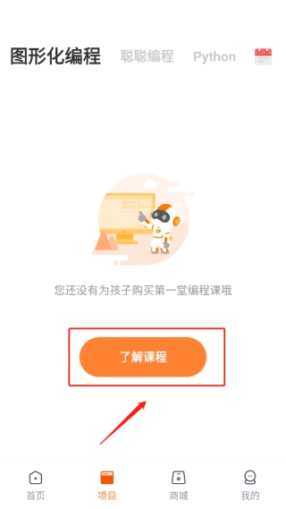 1、打开核桃编程家长端应用,点击底部导航栏的项目板块,随后点击页面中间位置的“了解课程”按钮。