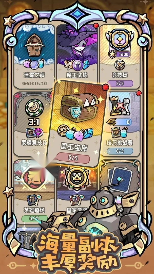 国王宝藏——一场轻松惬意、毫无压力的寻宝旅程;迷雾之海——充满未知惊喜的肉鸽式探险挑战;魔王试炼——难度层层升级,更有SSR装备等你来赢取;还有更多趣味副本,正等待你的探索发现。