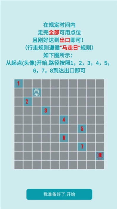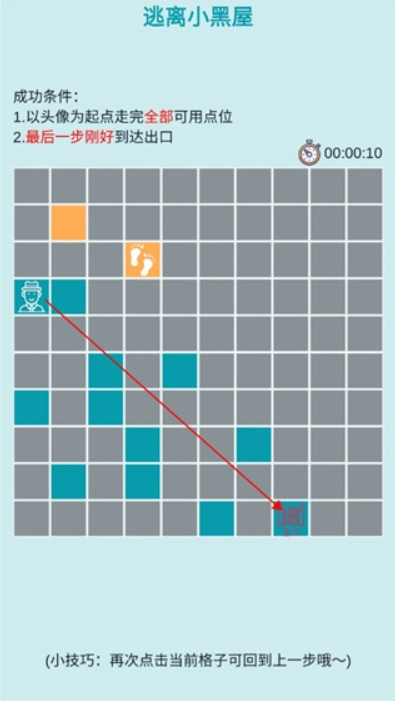 4、你得点击蓝色格子才能到达门口。这时候只能选蓝色格子,而且每个蓝色格子都必须点击到,点击之后会变成橙色。