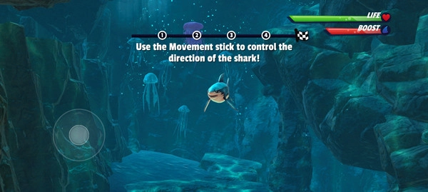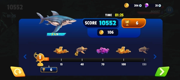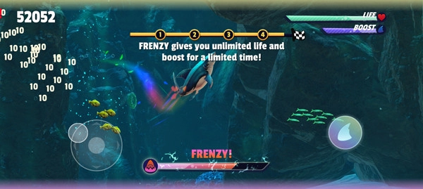 4.自由探索:完成新手教程后,就能开启畅快的探索之旅啦!操控鲨鱼畅快地捕食小鱼,等下方能量条填满时,就能触发超强加速度,帮助你拿下更高分数,全力向高分榜发起冲击。