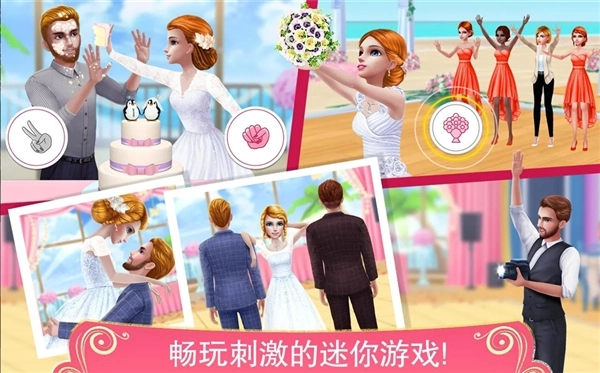 3、为美丽的新娘和帅气的新郎精心装扮,用心布置婚礼场景,装饰美味的蛋糕,编排迷人的舞步。