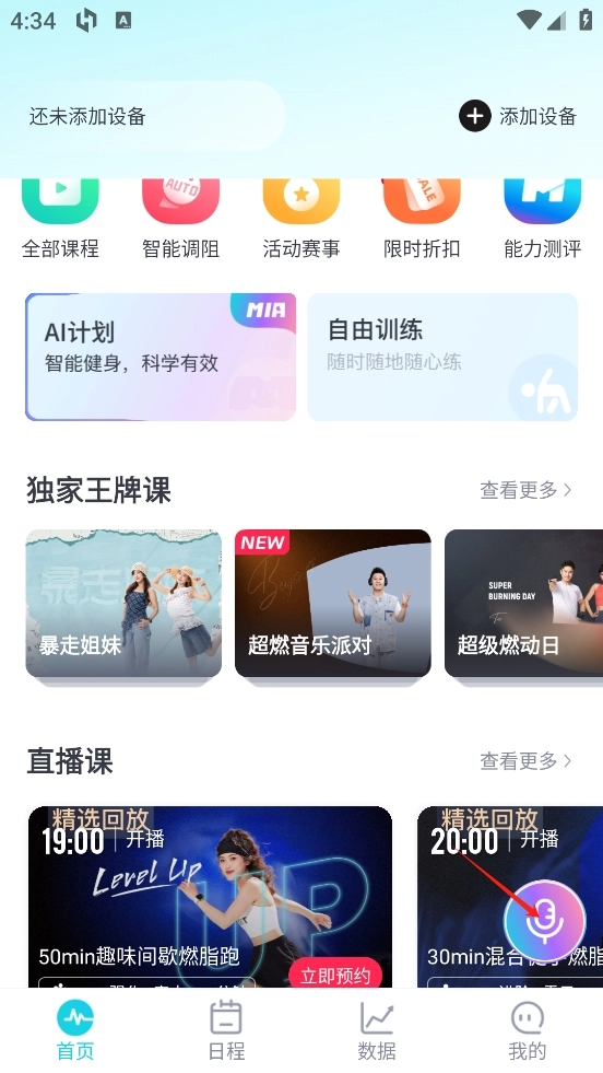 在本站完成安装后点击打开进入,在首页区域,您能够看到众多健身直播课程以及专业的优质老师。
