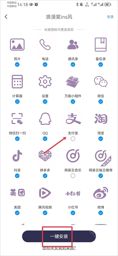 然后点击一键安装就行,要是有不想更换的图标,把对应的勾选取消掉就可以了。