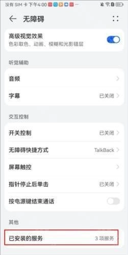 3、接着进入手机设置界面,打开【无障碍】选项,再找到【已安装的服务】这一项