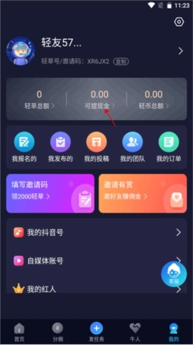 1、打开软件后,点击“我的”中“可提现金”。