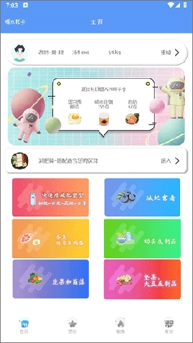1、打开,首页栏目有个人身高体重信息显示记录,以及减肥必知的基本知识和控制食物热量的食物热量统计。