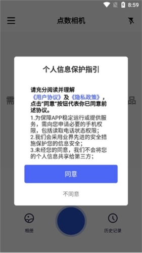 1、并安装本站提供的点数相机软件,进入之后需要先同意一下用户协议;
