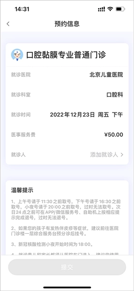 7、预约成功后,需在10分钟内完成挂号费及信息服务费支付,10分钟内未支付的预约号源将自动释放。支付完成后,请于就诊当日持注册时监护人身份证及手机确认短信来医院取号。