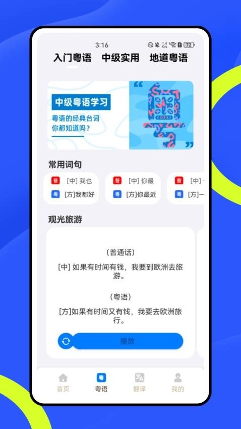 3、诸多常用词句内容,并且以入门、中级、地道粤语等方式为用户提供学习服务。