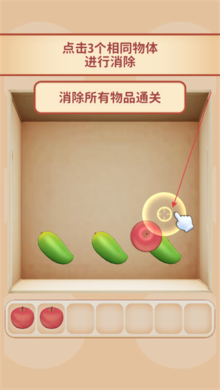 1. 轻点关卡中堆叠着的甜品、玩具、水果等物件,让它们进入下方的收集栏。