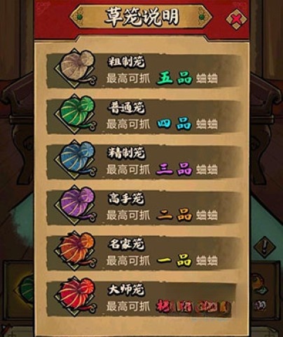 首先要准备几个草笼,这可是捕捉蛐蛐必不可少的工具。颜色鲜艳的草笼,能提高捕捉到高等级蛐蛐的概率。蛐蛐自身存在不同等级,范围从七品到神品。一般来说,等级越低的蛐蛐,力量往往相对较强。草笼有粗制、普通、精致等多种类别,草笼等级越高,捕捉蛐蛐的成功率也就越高。