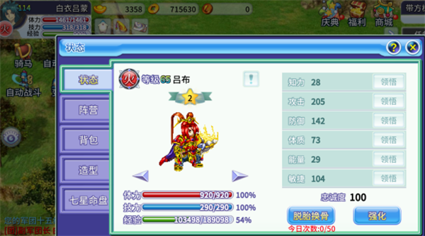 游戏内设有熔炉系统,每日完成任务可获得武将刷新令与装备刷新令,不氪金的玩家可以每天慢慢刷取。武将方面,带有火箭、投石、乱击这类技能的都值得留意,属性值自然是越高越好,三国名将也可以关注一下。如果暂时没有合适的武将,新手宠物蔡文姬可以用来过渡,游戏签到会赠送蔡文姬的金锁片,这个道具能让武将转身,转身之后技能和属性都会发生变化。很多武将支持二转,追求高属性的玩家可以考虑练到200级再转身,但像赵云这类武将,建议先练到30级完成一转,之后再练到200级进行二转,不必一开始就练到200级才一转。