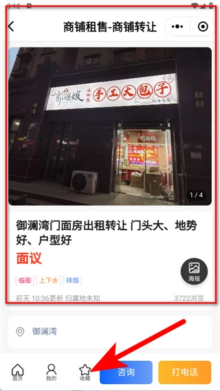 在商铺转让详情页面,你可以点击收藏按钮,完成信息收藏的操作。