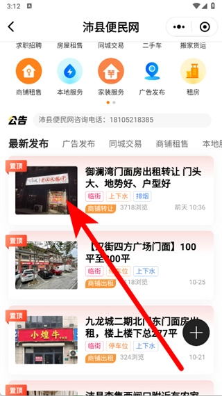 在服务分类页面,点击商铺转让信息,进入详情列表。